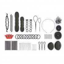 Amplia variedad de herramientas ideales para realizar multitud de peinados elegantes y sin esfuerzo. Updos, trenzas, lazos... con un acabado perfecto y moderno. Aguja de doble gancho. Trenzadora (19,5cm). 2 pinzas de esponja para bollo. Pequeño (16,5 cm) grande (23 cm) 2 trenzadoras de gancho (13,2cm). 2 Agujas para coletas. Pequeño (14,5 cm) grande (18 cm). Diadema ondulada negra metalizada. 60 bandas elásticas negras de Ø20mm. Trenzadora roja con gomaespuma. 10 scrunchies negros. 5 Alfileres Espiral Negros 5cm. 2 rosquillas. Relleno de lazo pequeño (Ø6cm) y grande (Ø8cm). 2 golpes. Almohadilla pequeña (8,5 cm de ancho) y grande (10 cm). 3 pinzas de gancho onduladas negras de 9cm. 7 pinzas onduladas negras de 5,7cm. 11 horquillas invisibles negras 7cm. Divisores de 2 secciones (10 x 6,2 cm).