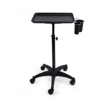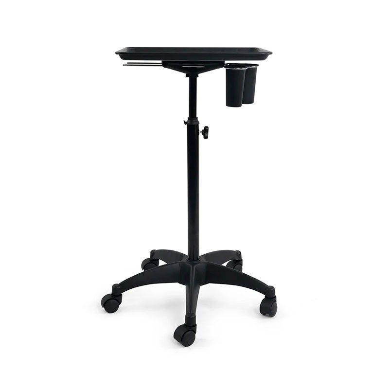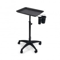 Incorpora una bandeja amplia para organizar herramientas y productos, junto con dos portaobjetos laterales ideales para vasos, tintes o utensilios de uso frecuente. Además, es regulable en altura y cuenta con base de 5 ruedas, ofreciendo máxima estabilidad y movilidad durante el servicio.