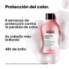 Este champú profesional para pelo teñido limpia suavemente mientras protege el color frente a la decoloración y mantiene la fibra capilar protegida frente a agresiones externas. Su fórmula profesional con resveratrol, un potente polifenol antioxidante, ayuda a prolongar la intensidad del color hasta 8 semanas y aporta hasta 6 veces más brillo.