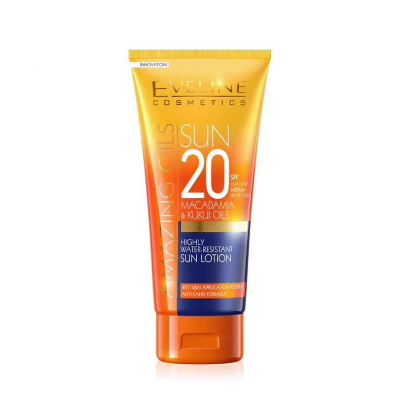 Sun 20 SPF UVA + UVB Alta Protección. Aceites de Macadamia y ACEITE DE NUEZ DE INDIA. Loción solar altamente resistente al agua. Posibilidad de aplicación en la piel húmeda. Fórmula Anti-Arena. Altamente resistente al agua Suntan Lotion Spf 20 es una innovación en protección solar. Gracias a la fórmula innovadora de WET APPLICATION COMPLEX, el producto se puede aplicar incluso sobre la piel húmeda. La fórmula ultra impermeable deja en la piel una película delicada que es la barrera perfecta para la radiación dañina, también durante el baño.