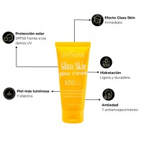 La Glass Skin Glow Cream SPF50 Levissime 50ml es una innovadora crema hidratante glass skin que combina hidratación, luminosidad y protección solar en un solo paso. Diseñada para conseguir el deseado efecto piel de cristal (glass skin), aporta un acabado jugoso, uniforme y radiante desde la primera aplicación.