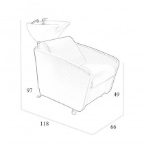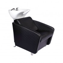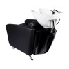 Fabricado con estructura de fibra de vidrio en color negro, cuenta con cerámica blanca basculante y grifería cromada completa incluida, garantizando un uso intensivo y una excelente resistencia al paso del tiempo. Su tapizado en polipiel negra, fácil de limpiar, aporta una estética limpia y profesional que encaja perfectamente en salones modernos.