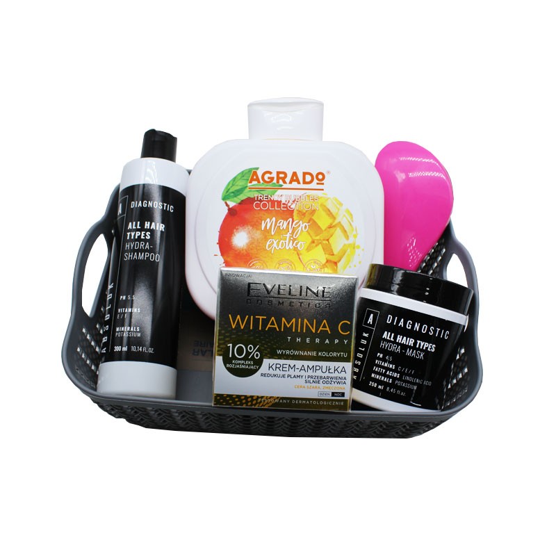 Cesta de Mazuelas especial compuesta por 1 unidad de cada de estos productos: - CREMA DE MANOS OLIVA GREEN PHARMACY 100ML. - CREMA REPARADORA PIES GREEN PHARMACY 75ML. - MASCARILLA ZIAJA FACIAL ANTI ESTRES ARCILLA 7ML. - BOMBA BAÑO JUMBO. - CREMA REVITALIZANTE FACIAL KENDRA ESSENTIAL 50ML. - LECHE DESMAQUILLANTE FACIAL KENDRA ANTI-AGE 200ML. - MASCARILLA REPARADORA KERATINA ESTEREOCOLOR SOBRE 50GR.