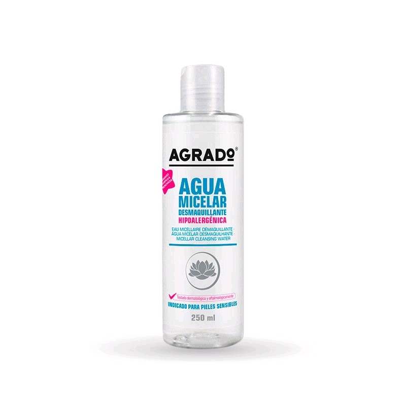 El Agua Micelar desmaquillante AGRADO ofrece una limpieza facial diaria simplificada gracias a su triple acción. En un solo paso, logra limpiar, desmaquillar y tonificar la piel. Su fórmula, dermatológica y oftalmológicamente probada, la hace perfecta para desmaquillar la zona de los ojos y es apta para pieles sensibles.