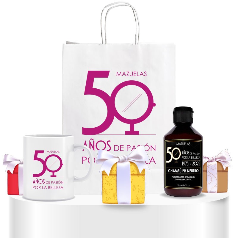 ¡Celebremos juntos 50 años de belleza y cuidado profesional! Mazuelas, tu marca de confianza en belleza y peluquería, conmemora su medio siglo de trayectoria con un lote exclusivo diseñado especialmente para ti. Este set único reúne productos y sorpresas que reflejan nuestra pasión por cuidar de ti y tu cabello, con la calidad que nos ha distinguido durante cinco décadas.