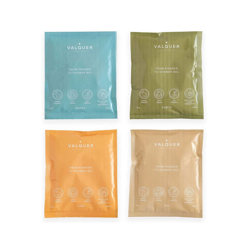 Pack de sobres de 25 gr con la fragancia Agua que se convertirán en geles de 400 ml de gel de baño sostenible y natural.