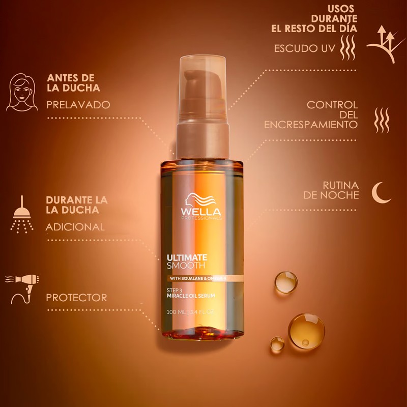 El Sérum Miracle Oil Ultimate Smooth de Wella Professionals es la solución perfecta para cabellos secos, apagados, encrespados o quebradizos. Su fórmula ligera en textura de sérum proporciona una hidratación profunda en solo 30 segundos, dejando el cabello más suave, flexible y brillante hasta por 72 horas.