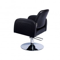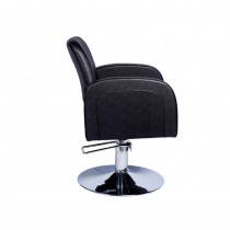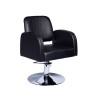 Sillón perfecto para peluquería. Tapizado fácil de mantener en polipiel negro. Con pie en forma redonda y bomba hidráulica.