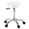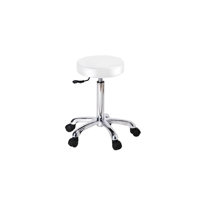 Taburete elegante y cómodo de diseño ergonómico. asiento plano y altura regulable mediante pistón de gas. Tapizado en PU de gran calidad. Base cromada con ruedas.