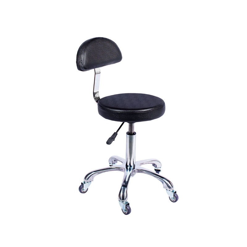 Taburete redondo giratorio con respaldo. Tapizado fácil de mantener en polipiel negro.