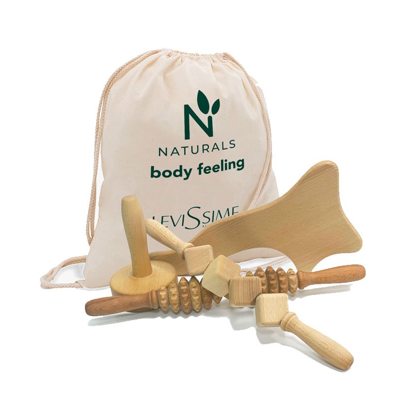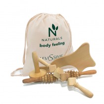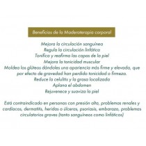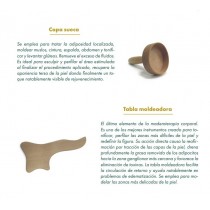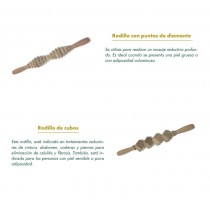 El kit de rodillos de masaje de maderoterapia ayuda a combatir los depósitos de grasa desagradables y elimina el aspecto de la piel de naranja. Estos rodillos de madera mejoran la circulación sanguínea, moldean los músculos y suavizan la piel. El set es ideal para trabajar el masaje anticelulítico. Rodillo con puntas de diamante: Se utiliza para realizar un masaje reductivo profundo. Es ideal cuando se presenta una piel gruesa o con adiposidad voluminosa. Rodillo de cubos: Este rodillo, está indicado en tratamientos reductores de cintura, abdomen, caderas y piernas para eliminación de celulitis y fibrosis. También, está indicado para las personas con piel sensible o poca adiposidad. Copa sueca: Se emplea para tratar la adiposidad localizada, moldear muslos, cintura, espalda, abdomen y tonificar y levantar glúteos. Remueve el exceso de fluidos. Es ideal para esculpir y perfilar el área estimulada al finalizar el procedimiento aplicado, recupera la apariencia tersa de la piel dando finalmente un toque notablemente visible de rejuvenecimiento. Tabla moldeadora: El último elemento de la maderoterapia corporal. Es uno de los mejores instrumentos creado para tonificar, perfilar las zonas más difíciles de la piel y redefinir la figura. Su acción directa causa la reafirmación por tracción de las capas de la piel, drena profundamente la grasa removida de los adiositos hacia la zona ganglionar más cercana y favorece la eliminación de toxinas. La tabla moldeadora facilita la circulación de retorno y ayuda notablemente en problemas de edematización. Se emplea para modelar las zonas más delicadas de la piel.