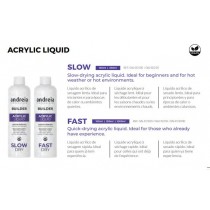 Con el líquido acrílico de secado rápido FAST de Andreia ofrece un trabajo perfecto en menos tiempo, de esta manera tus clientes gozarán de esas uñas acrílicas duraderas y de alta resistencia, además es un Producto 100% Vegano Los líquidos acrílicos de Andreia viene de 2 tipos. El Líquido Acrílico FAST, es ideal para los que tienen experiencia. Disponible en 100, 250 y 1000ml. Modo de empleo: - Se recomienda utilizar un vasito de cristal y verter el líquido en él. - Sumergir el pincel en el vasito. - Con la punta del pincel recoger un poco del polvo acrílico para que se pueda formar unas esferas pequeñas de producto - Aplicar sobre la uña como de costumbre formando la uña con el pincel - Una vez seco, limar para finalizar hasta que quede uniforme..