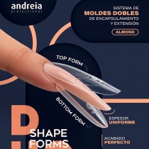 Los Moldes Uñas Dobles Andreia Duo Shape Forms Almond son un sistema profesional de molde dual para uñas diseñado para realizar extensiones y encapsulados con rapidez, precisión y un acabado perfecto. Este sistema de moldes para uñas de doble espesor combina un molde base y un molde superior que permiten trabajar el producto de forma controlada para conseguir una estructura uniforme y natural.