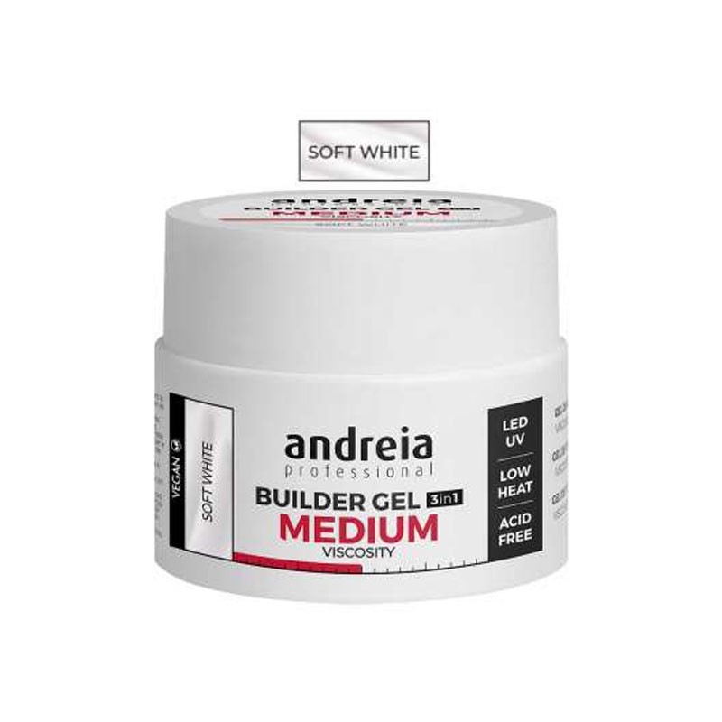 Gel de construcción 3 en 1 color blanco lechoso, de media viscosidad, sin ácidos y sin calentamiento. Ideal para trabajos profesionales con una estructura sólida, natural y duradera. El gel Builder de Andreia combina base, construcción y acabado en un solo producto, garantizando una aplicación rápida, segura y de alta resistencia.